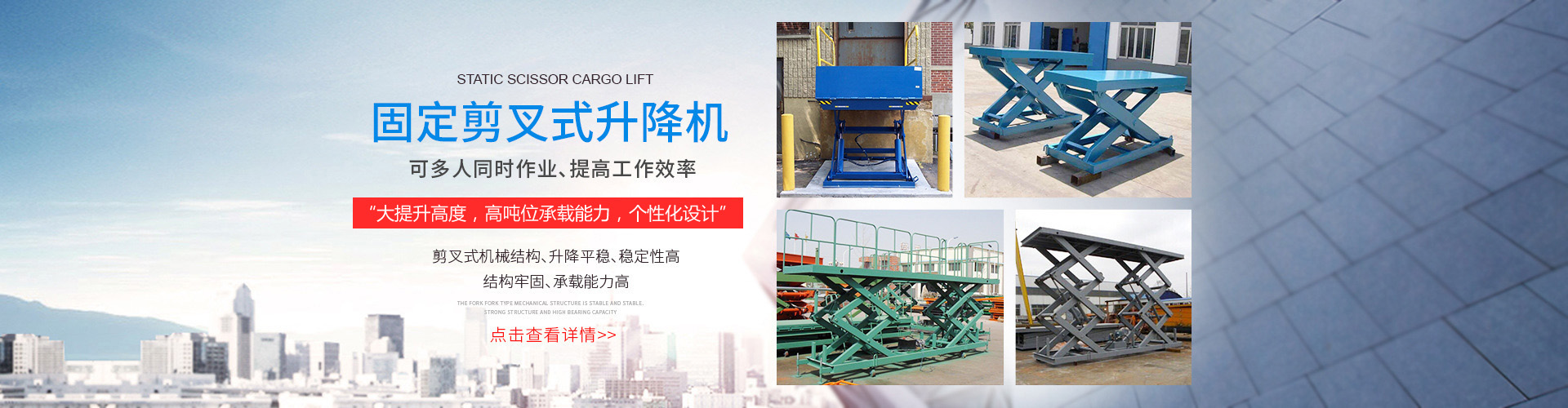 常見的升降平臺類型有剪叉式升降平臺、鋁合金升降平臺、曲臂式升降平臺、直臂式升降平臺等。剪叉式升降平臺結構較為簡單,穩定性好,適用于室內外一般...